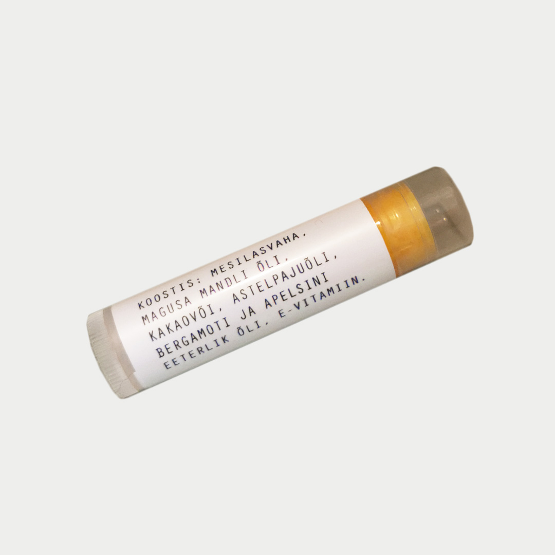 Koostis: Mesilasvaha, magusa mandli õli, kakaovõi, astelpajuõli, bergamoti ja apelsini eeterlik õli, e-vitamiin